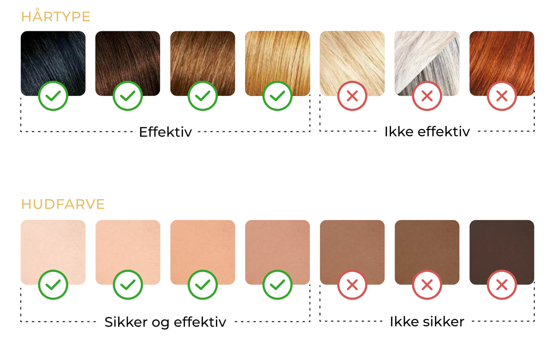 Hos mennesker med mørkere hud er der risiko for forbrændinger. IPL virker ikke på meget lyse hår, da melaninniveauet ikke er tilstrækkeligt højt. Ligeledes har røde hår en melanintype kaldet pheomelanin, som ikke absorberer energien fra IPL, hvorfor behandlingen som udgangspunkt ikke fungerer på røde hår. Se nedenstående skemaer for at vurdere om IPL vil kunne fjerne din hårvækst, og hvilket styrkeniveau du bør bruge med Comforth IPL