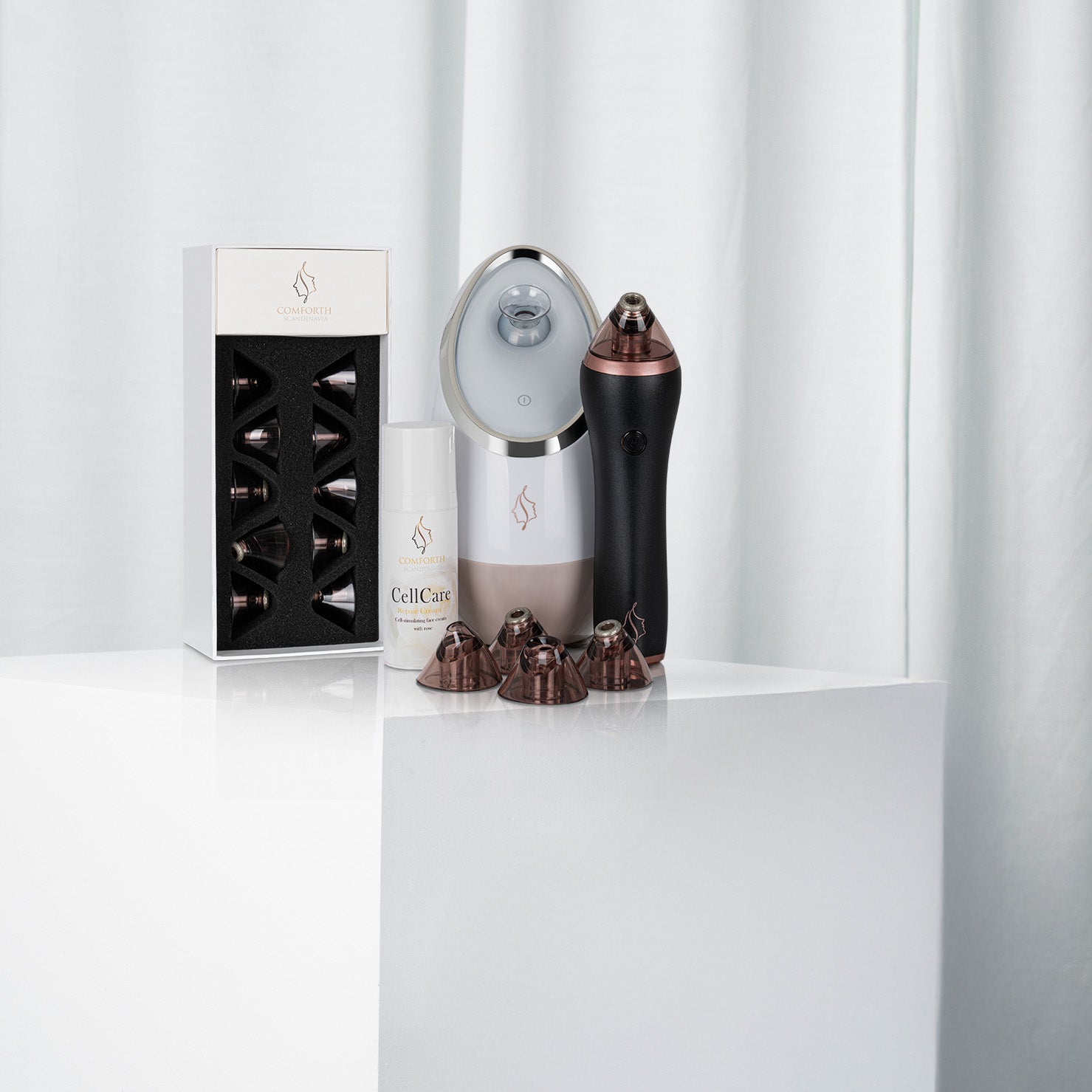 henvender sig til dig, der ønsker en mere komplet og afslappende behandling. Udover MicroDerm-enheden får du også Comforth Nano-Ionisk Ansigtsdamper, som forbedrer din diamantslibning ved at forberede huden og åbne porerne, samt CellCare Repair Creme med vildrose, der nærer og genopbygger huden efter behandlingen.