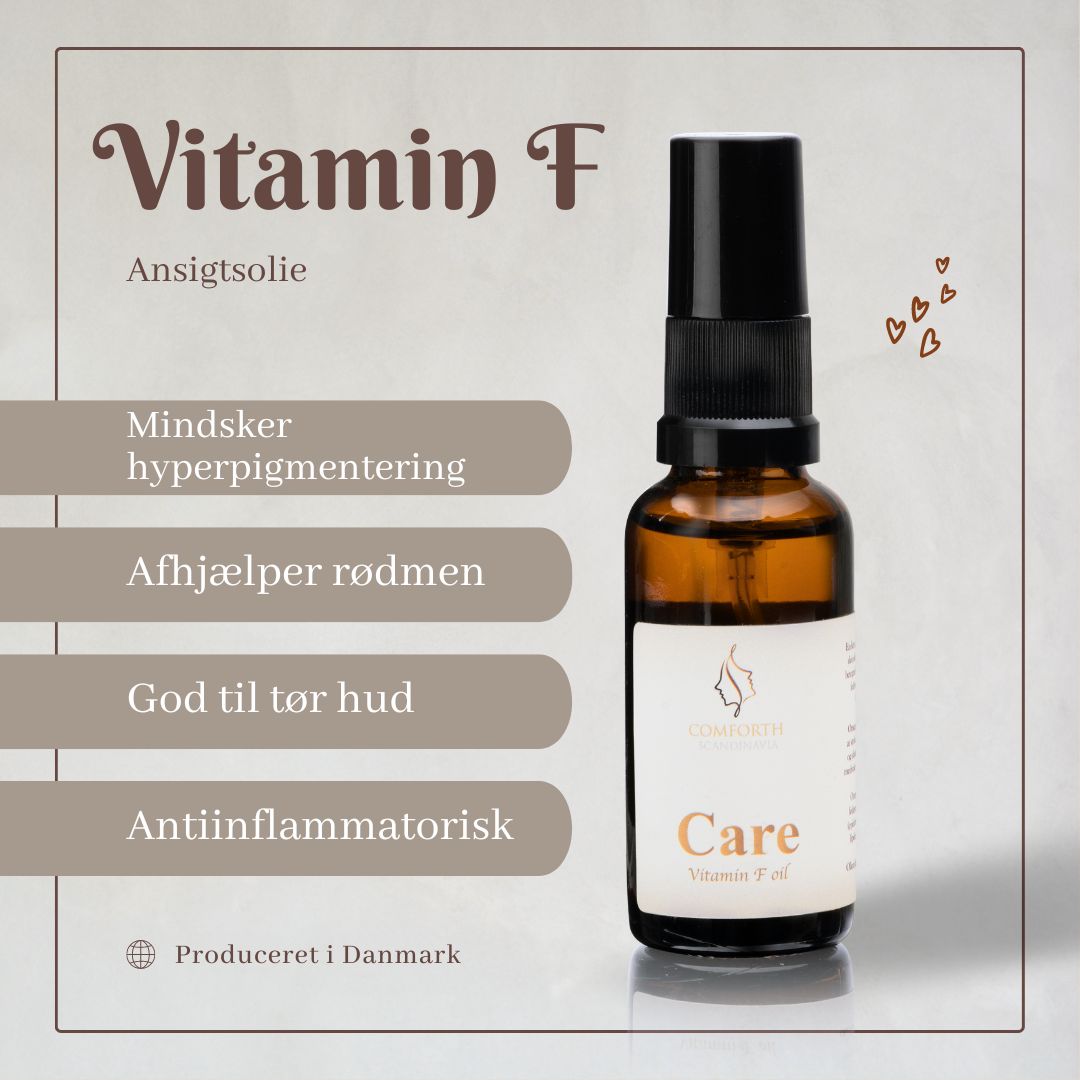 Vitamin F er en betegnelse for to essentielle, flerumættede fedtsyrer: linoleic acid (omega-6) og linolenic acid (omega-3). Omega-3 og omega-6 bidrager begge til at styrke hudens barriere, så fugtniveauet og elasticiteten bevares. Desuden kan de medvirke til at mindske hyperpigmentering. Omega-6 udgør hovedandelen af dén fedtsyre, der findes i hudens øverste lag (epidermis) og er samtidig forløber for dé lipider i huden, som kaldes ceramider.
