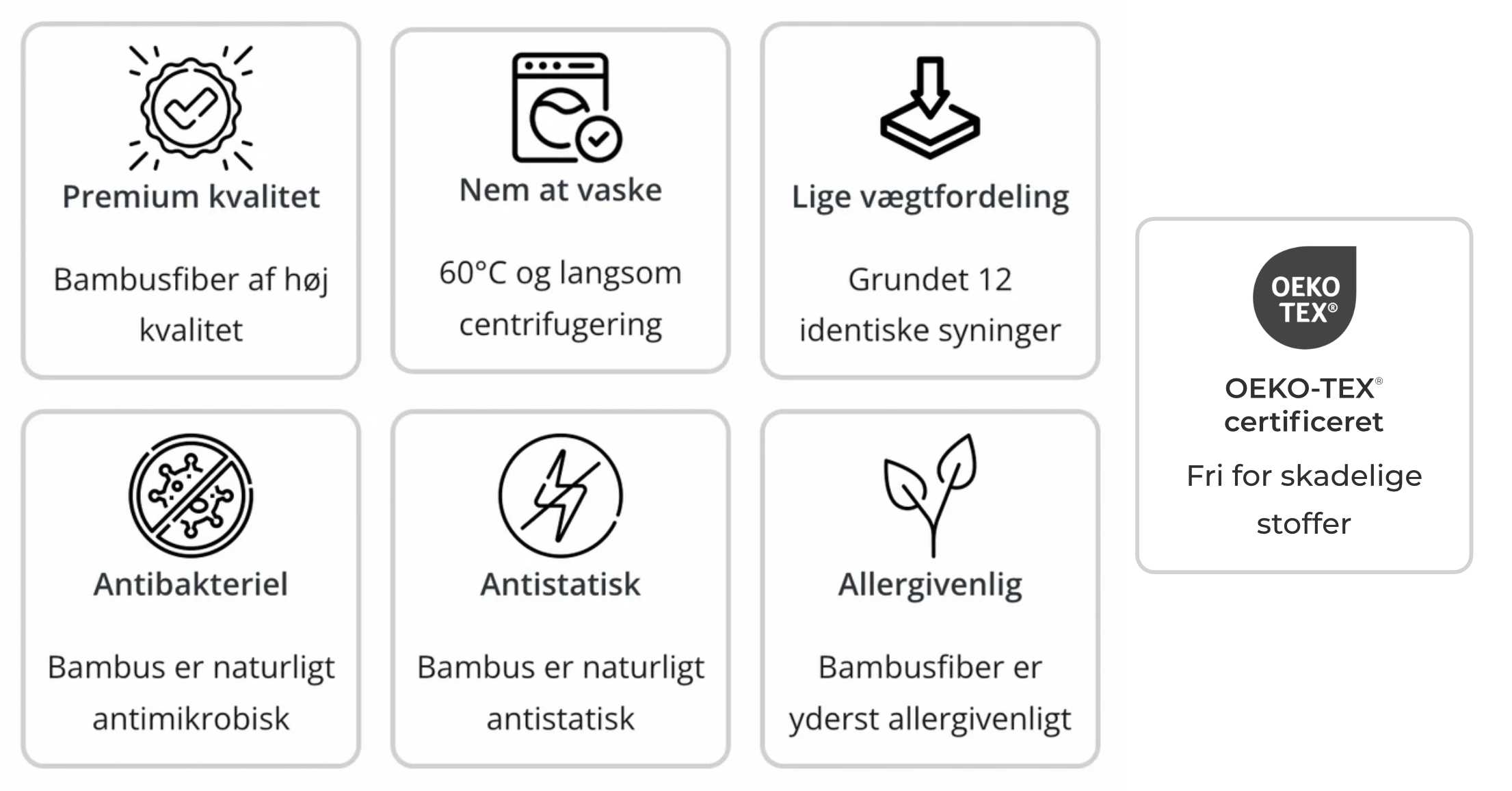 - Kølende, fugttransporterende og let for huden at ånde i. Da bomuld absorberer fugt og holder på varmen, leder bambus fugten væk og holder ikke på varmen i nær så høj grad, hvilket giver en dejlig, kølig soveoplevelse.