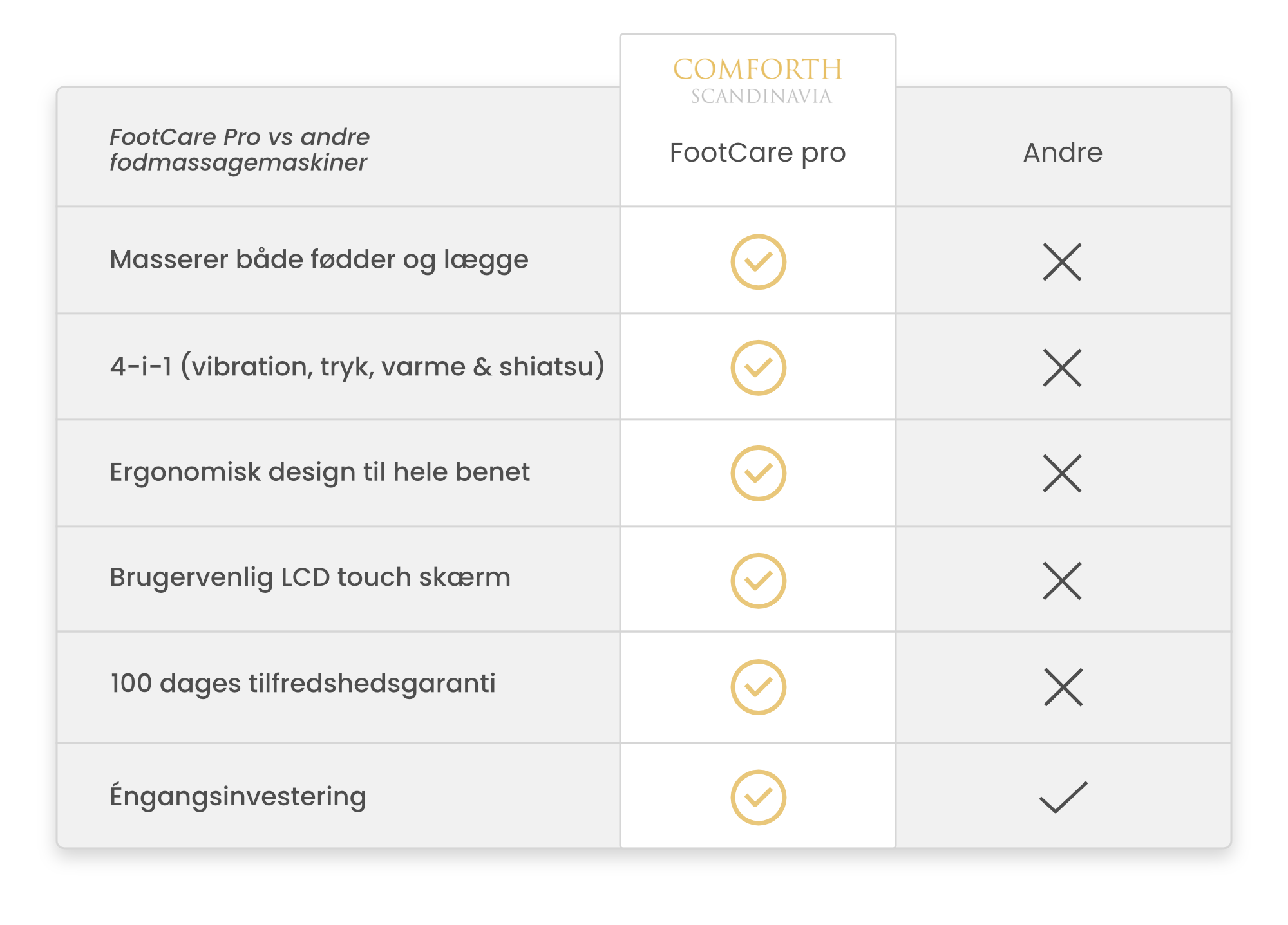 Comforth FootCare Pro adskiller sig markant fra andre fodmassagemaskiner på markedet. Hvor de fleste produkter udelukkende fokuserer på fødderne, tilbyder FootCare Pro en dybdegående massage, der også dækker læggene.